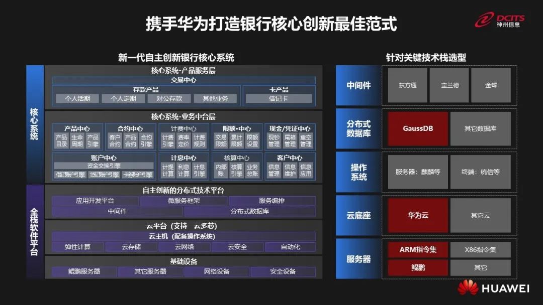 神州信息携手华为打造的新一代自主创新银行核心系统及解决方案在本次大会正式亮相。在产品服务层与业务中台层进行全面自主创新,其全栈软件平台包括分布式数据库、云平台(一云多芯)、鲲鹏服务器等,解决方案及落地案例覆盖IT基础架构全生命周期的规划咨询、架构设计、集成交付、集成管控、智能运维、系统迁移、灾备建设等领域。
